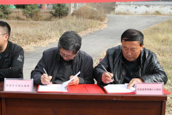 陜建延安建投集團總經(jīng)理苗壯(左)與吳起縣周灣鎮(zhèn)小口則村支部書記雷鳴寬(右)代表雙方簽訂推銷協(xié)議。