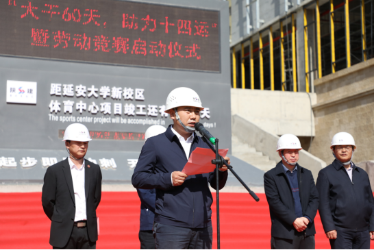 延安大學(xué)黨委委員、副校長(zhǎng)楊偉宏致辭,他代表延安大學(xué)全體師生向疫情期間奮戰(zhàn)在一線的施工人員及陜建集團(tuán)表示衷心感謝,對(duì)十三建公司承建的延大體育中心項(xiàng)目建設(shè)給予充分肯定。他指出,延安大學(xué)體育中心項(xiàng)目作為十四運(yùn)重點(diǎn)建設(shè)項(xiàng)目,意義重大。當(dāng)前,項(xiàng)目建設(shè)進(jìn)入60天倒計(jì)時(shí),希望全體參建人員從延安精神中汲取力量,大力弘揚(yáng)愛崗敬業(yè)、艱苦奮斗的勞模精神,進(jìn)一步統(tǒng)一思想,提高認(rèn)識(shí),鼓足干勁,用一流的速度,一流的品質(zhì),展現(xiàn)陜建集團(tuán)的國(guó)企風(fēng)采和責(zé)任擔(dān)當(dāng),為第十四屆全運(yùn)會(huì)順利召開貢獻(xiàn)力量。