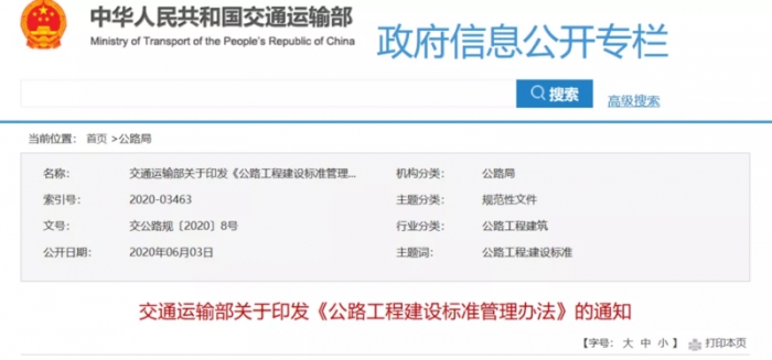近日,交通運(yùn)輸部發(fā)布《關(guān)于印發(fā)<公路工程建設(shè)標(biāo)準(zhǔn)管理辦法>的通知》。該辦法共五章二十八條,自2020年7月1日起施行,有效期5年。