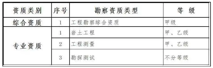 保留綜合資質(zhì)。將4類專業(yè)資質(zhì)及勘察勞務(wù)資質(zhì)整合為巖土工程、工程測(cè)量、勘探測(cè)試等3類專業(yè)資質(zhì)。專業(yè)資質(zhì)等級(jí)壓減為甲、乙兩級(jí)(勘探測(cè)試專業(yè)資質(zhì)不分等級(jí)),原丙級(jí)資質(zhì)并入相應(yīng)專業(yè)乙級(jí)資質(zhì)。