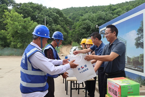 會后,鄭發(fā)龍一行為項目一線建設(shè)者和工友代表發(fā)放了花露水、霍香正氣水、西瓜、綠豆等慰問品。